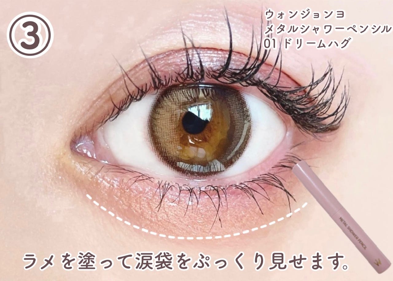 ③ 涙袋にラメを塗ります。今回はウォンジョンヨ メタルシャワーペンシル 01ドリームハグを使いました。