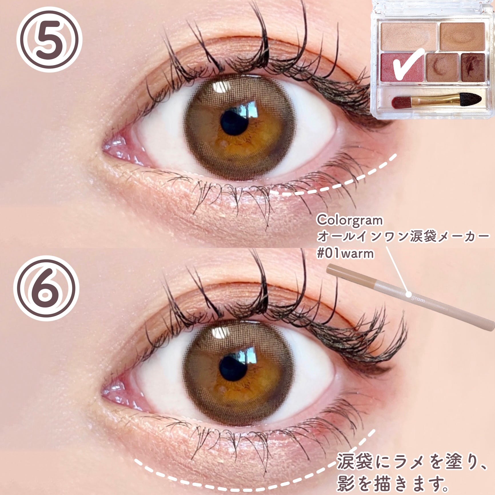 ⑥ 涙袋にラメを塗り、影を描いてぷっくり見せます。涙袋にはColorgram オールインワン涙袋メーカー # 01warmを使いました。