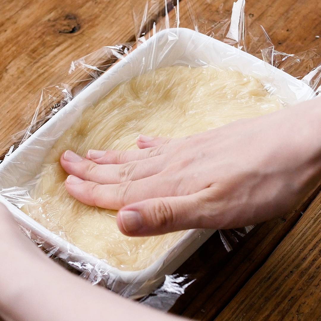 水で濡らした容器に流し入れ、ラップをして冷蔵庫で冷やします。