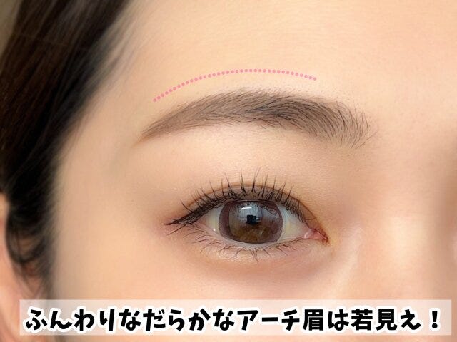 眉尻は眉頭より下がらないように描き、眉山はなだらかにアーチを作ると若々しく見えます。ふんわりとしたアーチ形は年齢よりマイナス5歳に見えますよ!
