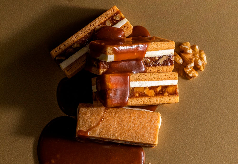 自家製キャラメルにくるみを敷きつめて バタークリームと2層に重ねたこっくり秋色のバターサンド。さくさくほどけるクッキーと、なめらかなキャラメル、とろける口どけのバタークリームに、香ばしいくるみの心地よい⻭ごたえが絶妙なバランス。ひとくち頬張れば、芳醇なくるみの香りがお口いっぱいに広がる、実りの秋にぴったりなおすすめの一品。