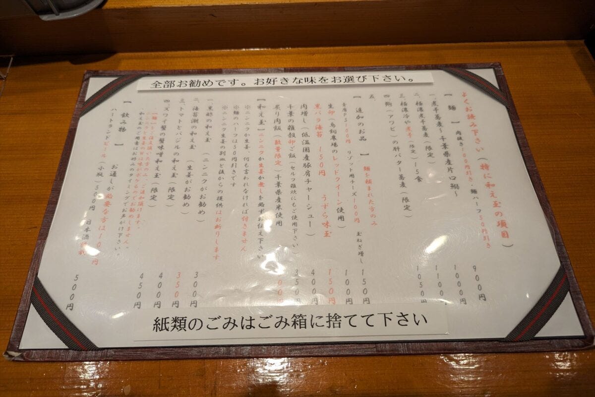 メニューは煮干しそばをメインに、数種類の追加和え玉やご飯が数種類。どれもおすすめなので何を食べても良いのだが、記者はまずスタンダードな千葉県産のカタクチイワシを使った煮干しそばを注文した。