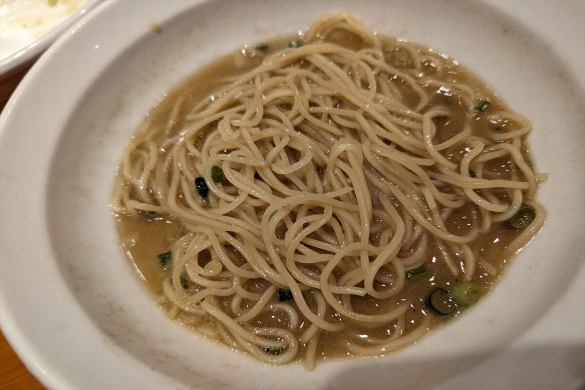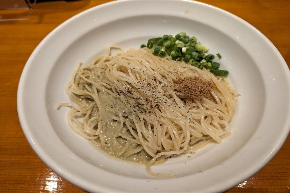 和え玉はズワイガニの蟹みそ和え玉を注文。濃厚な蟹みそにブラックペッパーが効いた和え玉は、そのまま食べても美味しいのだが...