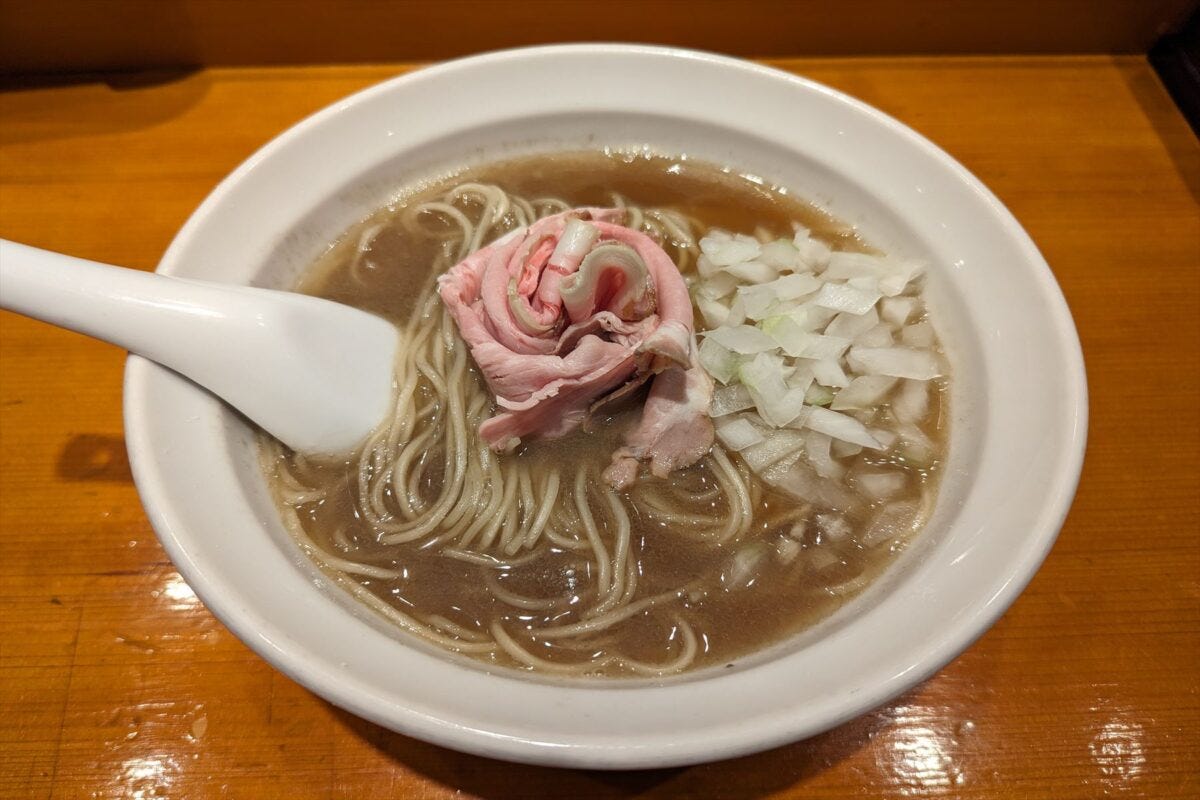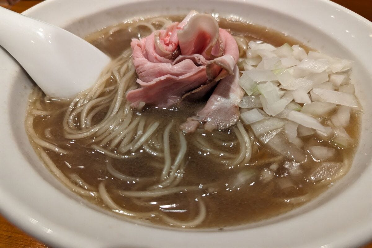 煮干しの香りをがっつり感じながらも嫌味は無く、旨さを引き出したスープに硬めに茹でられた麺がよく合う。刻み玉ねぎはさわやかさをプラスし、ジューシーなチャーシューはそのままでも麺と一緒に食べても最高だ。