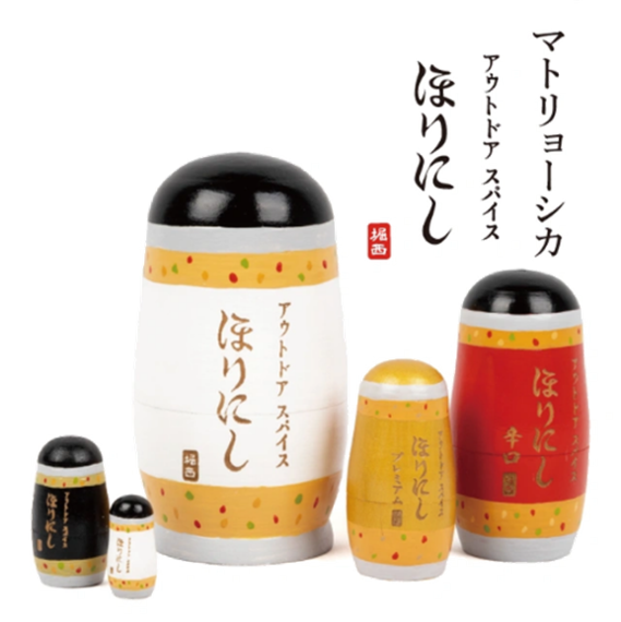 リターン商品はホリネーズ3個セットと「ちびにし」が税込み2550円など35種類。「ほりにしマトリョーシカ」も製作した。マトリョーシカは入れ子の中から次々と小さな人形が出てくることから、ロシアでは家族の象徴とされ、家族円満や子孫繁栄の意味合いがある。