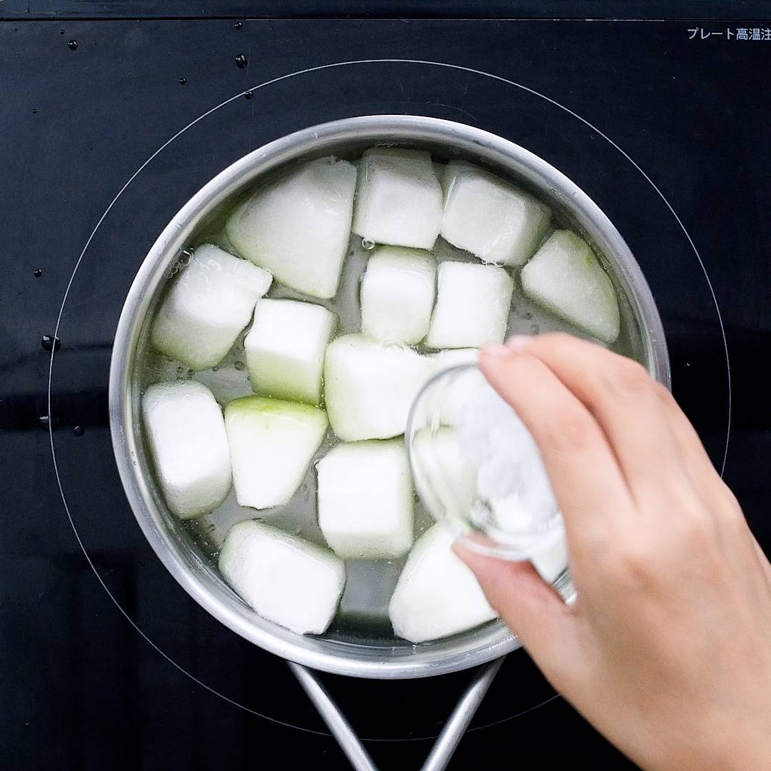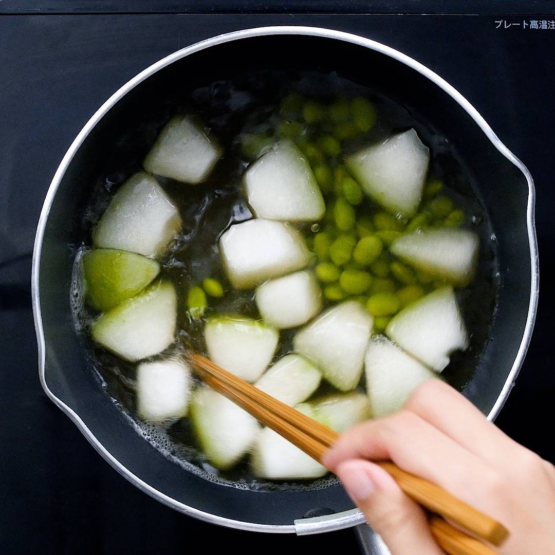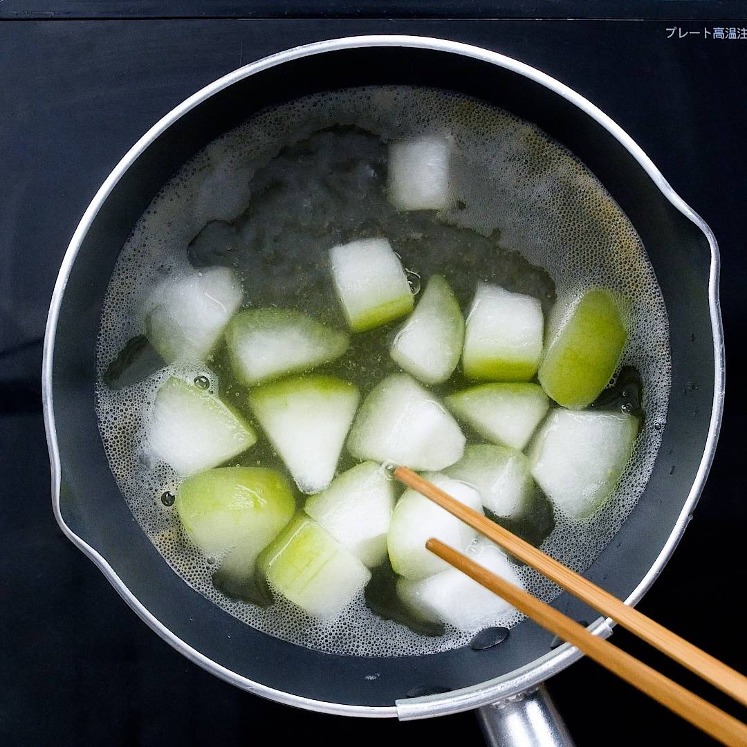 鍋に水(分量外)をたっぷり入れ、塩少々(分量外)、冬瓜を入れてやわらかくなるまで煮たら水気を切ります。