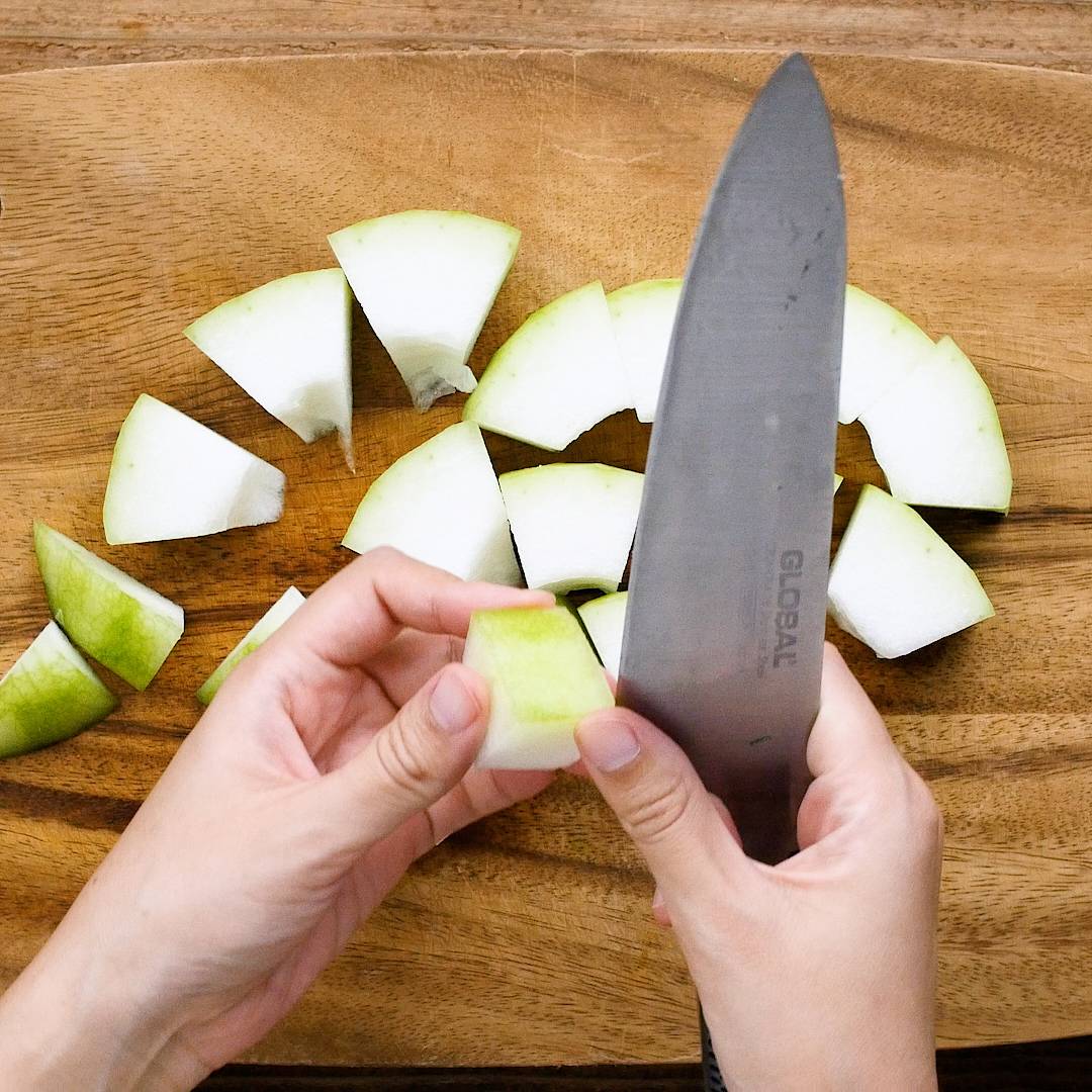 冬瓜は皮とワタを除き、ひと口大に切って面取りをします。