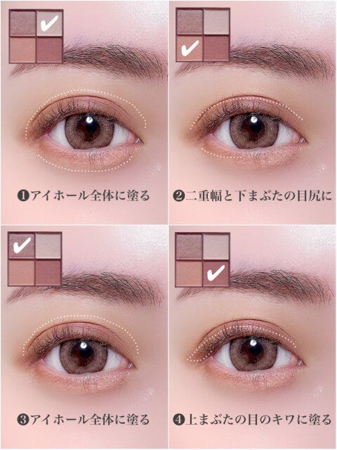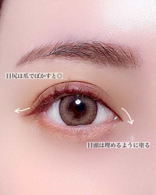 アイホール全体に右上→二重幅に左下→さらにアイホールに左上を重ねる形で塗り、深みを出します。目のキワは暗すぎない締め色で抜け感を出します。