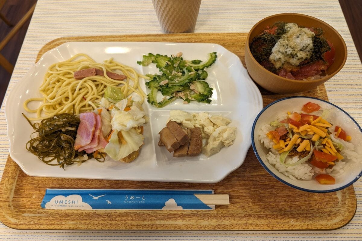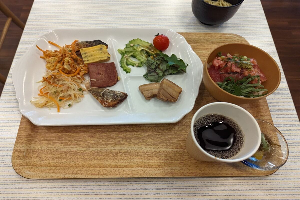 それ以外にもしっかり皮がついたラフテーや、健康的なゴーヤのツナ和えなど、こってりしたイメージがある沖縄料理とは対照的な健康沖縄料理を朝から楽しめるのは素晴らしい。