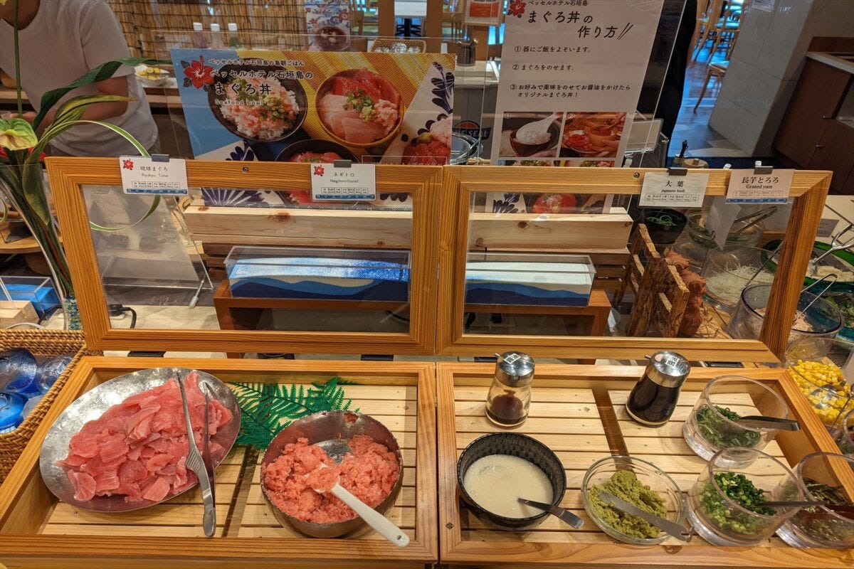 朝食は一般的なビジネスホテルで提供される種類の料理はほぼそろっているが、それ以外でイチオシなのが「まぐろ丼」。石垣島は美味しいまぐろが獲れる漁場でもあり、そこで食べるまぐろ丼は格別だ。
