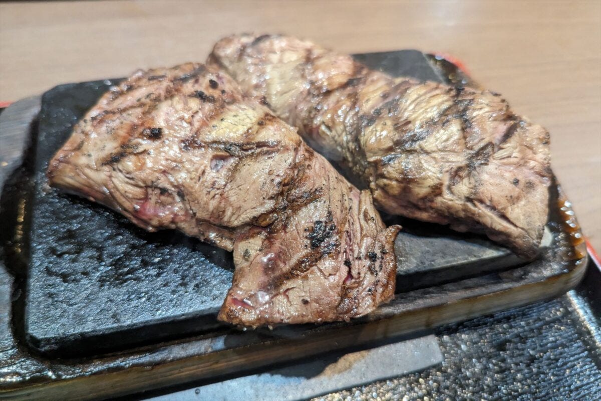 記者は柔らかくて脂の少ないハラミステーキをダブルで注文したのだが、アツアツに熱した板からはみ出るハラミが2つのっておりインパクト満点。