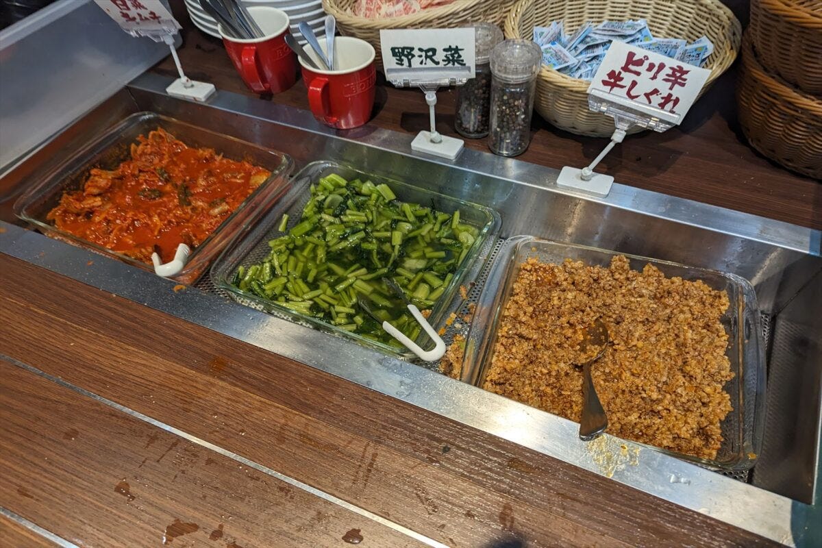 副菜はキムチと野沢菜漬け、ピリ辛牛しぐれの3種類。とくに牛しぐれはごはんに絶妙に合うため、ちょっとお財布に余裕が無い人は850円のチキンステーキを注文し、牛しぐれをメインに、キムチや野沢菜でおかわり自由のご飯を食べると低予算で幸せになれるかも。