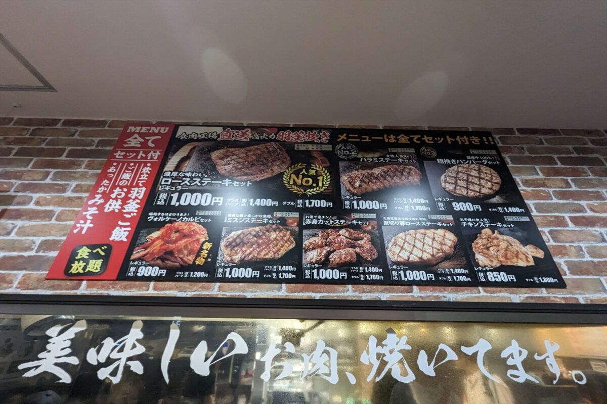 価格は関東エリアだとステーキがライスやみそ汁など食べ放題付きで1,000円からと非常にリーズナブル。ハンバーグやカルビは900円とさらに安く、チキンになると850円と激安だ。