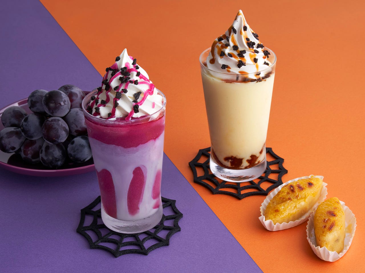 ドリンクは、紫の魔女をイメージし、芳醇な巨峰を使用した『Happy Halloween魔女の巨峰スムージー』と、ハロウィンを象徴するジャックオーランタンをイメージし、さつまいもをふんだんに使用した、『Happy Halloween スイートポテトスムージー』が登場。