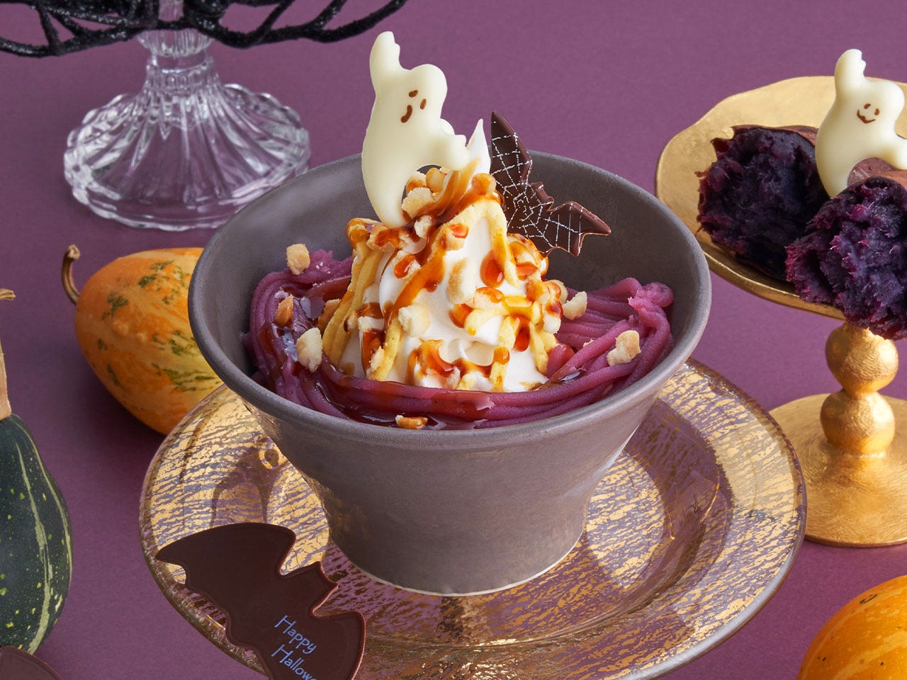 サンマルクカフェオリジナルの北海道産ミルクを使用したソフトクリームや、かぼちゃのムースと濃厚な紅いものクリーム、やわらかい食感のバタークッキーとカラメルソースに、おばけとこうもりを模したチョコレートをトッピング。