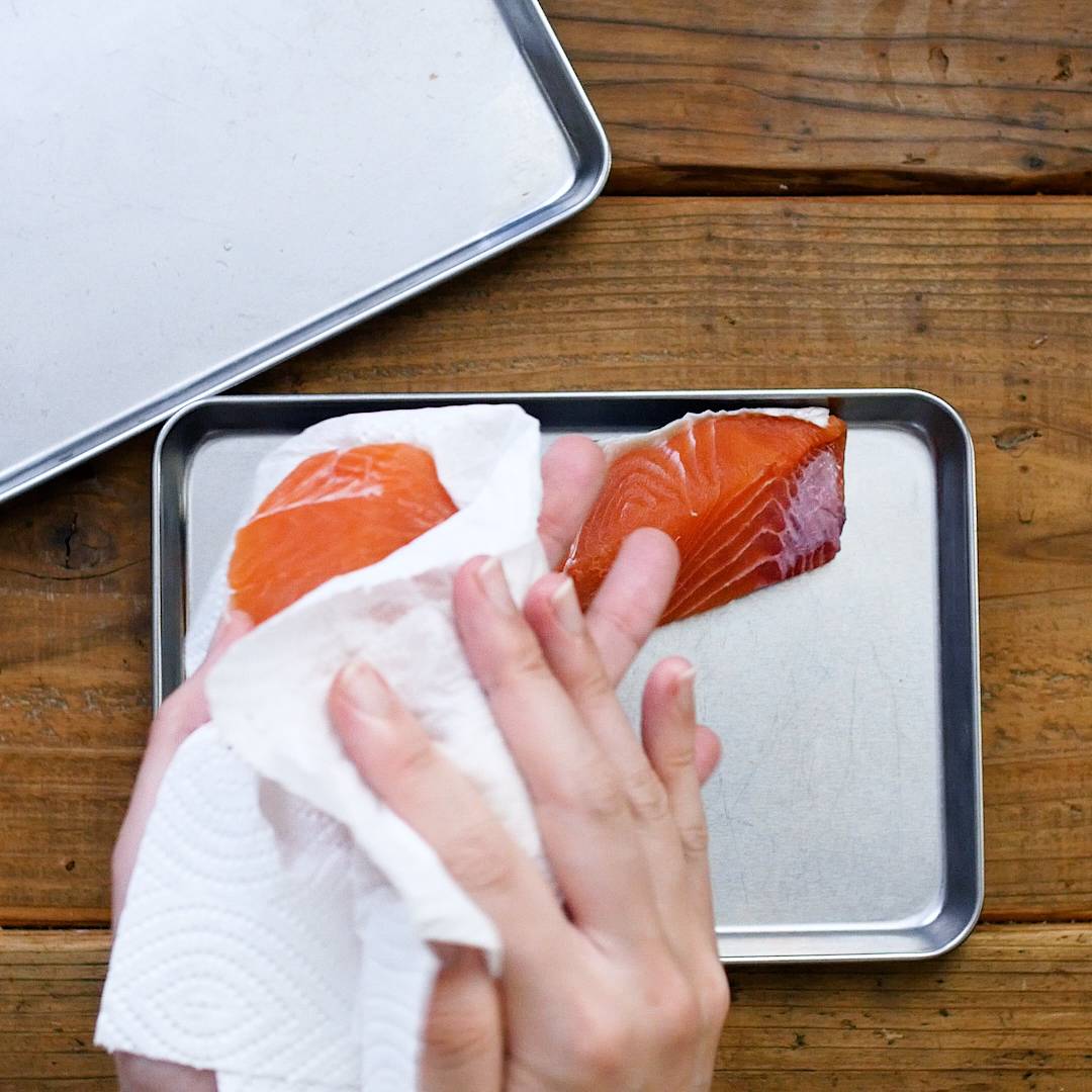 バットに生鮭を置いて酒をふり、10分ほど置きます。キッチンペーパーで水気をしっかりと拭き取ります。