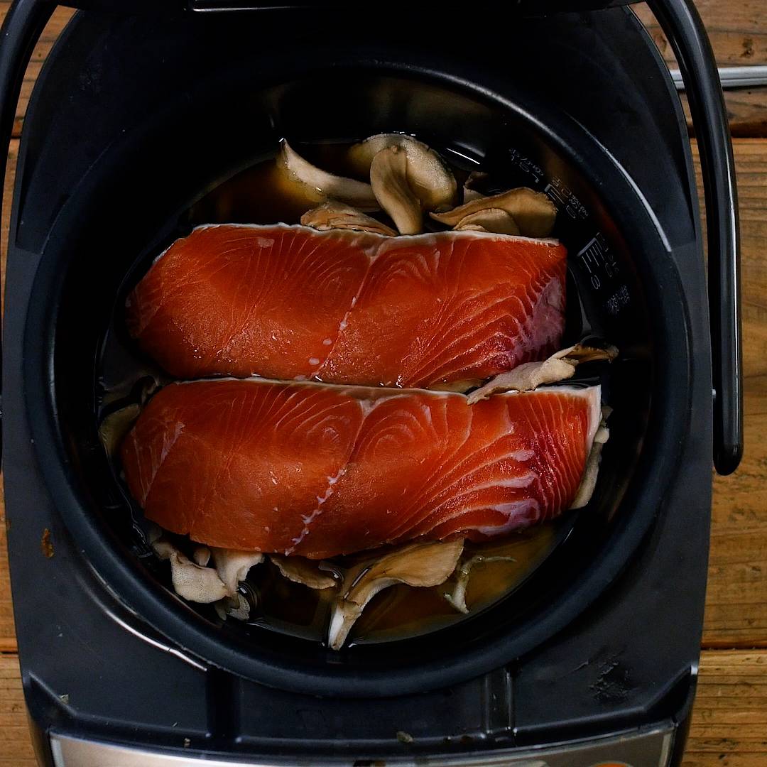 まいたけ、生鮭をのせ、炊き込みご飯モードで炊飯します。