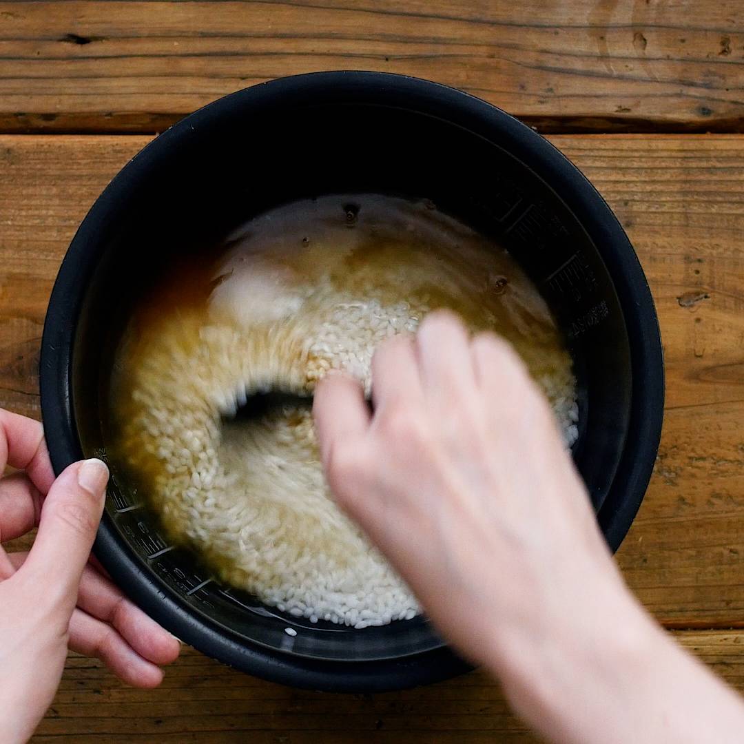 炊飯釜に米、めんつゆ、水を2合目の目盛りまで注ぎ入れ、軽く混ぜます。