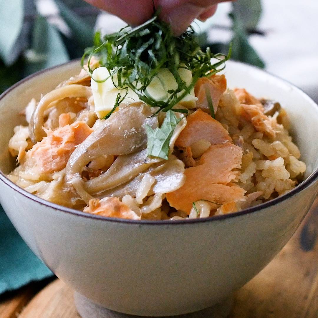 ・米 … 2合・生鮭 … 2切れ・酒 … 大さじ1杯・まいたけ … 1パック(100g)・めんつゆ(3倍濃縮) … 大さじ3杯・水 … 2合目の目盛りまでトッピング・バター(有塩) … 20g・大葉 … 4枚【下ごしらえ】鮭と舞茸の炊き込みご飯