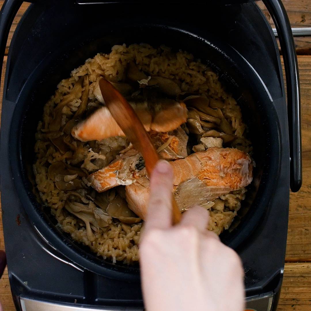 炊き上がったら鮭の皮、骨を取り除き、切るように混ぜます。