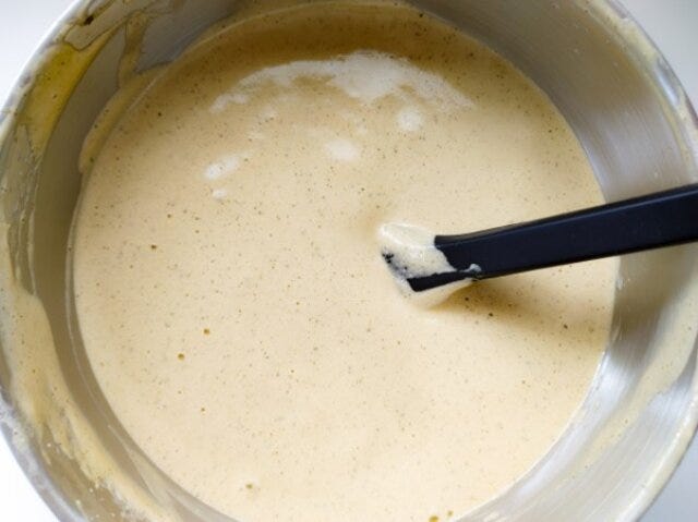 ⑧ メレンゲの1/3を卵黄生地に加え、ホイッパーでグルグルしっかり混ぜる。
