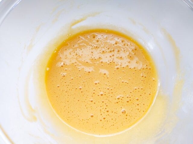 ・卵を卵黄と卵白に分け、卵白は冷蔵庫で冷やす。