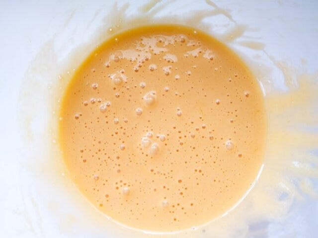 ① 卵黄にきび砂糖を加え、ホイッパーで混ぜてきび砂糖を溶かす。