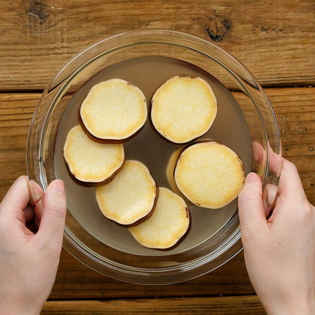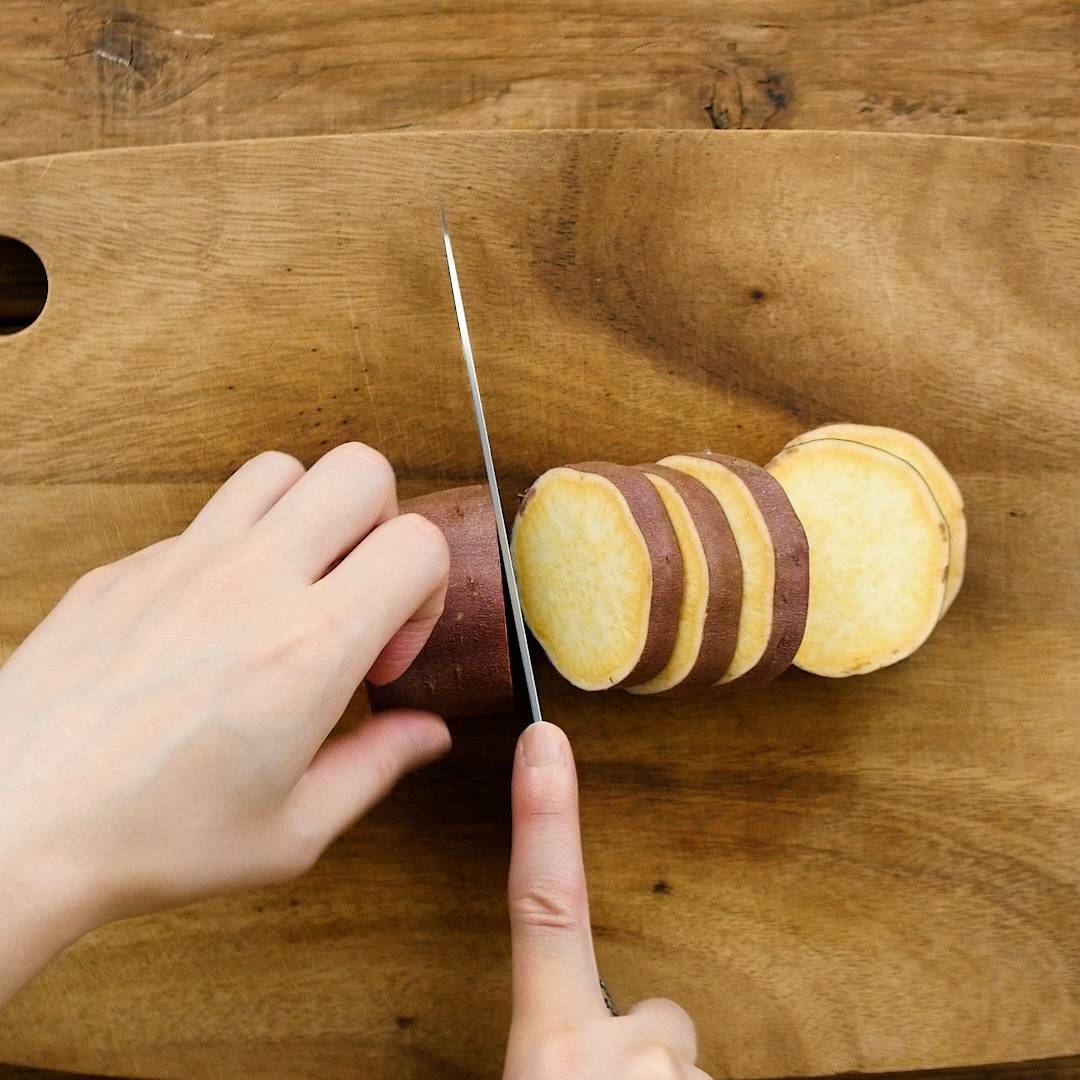 さつまいもを1cm幅の輪切りにして水にさらし、水分を拭き取ります。