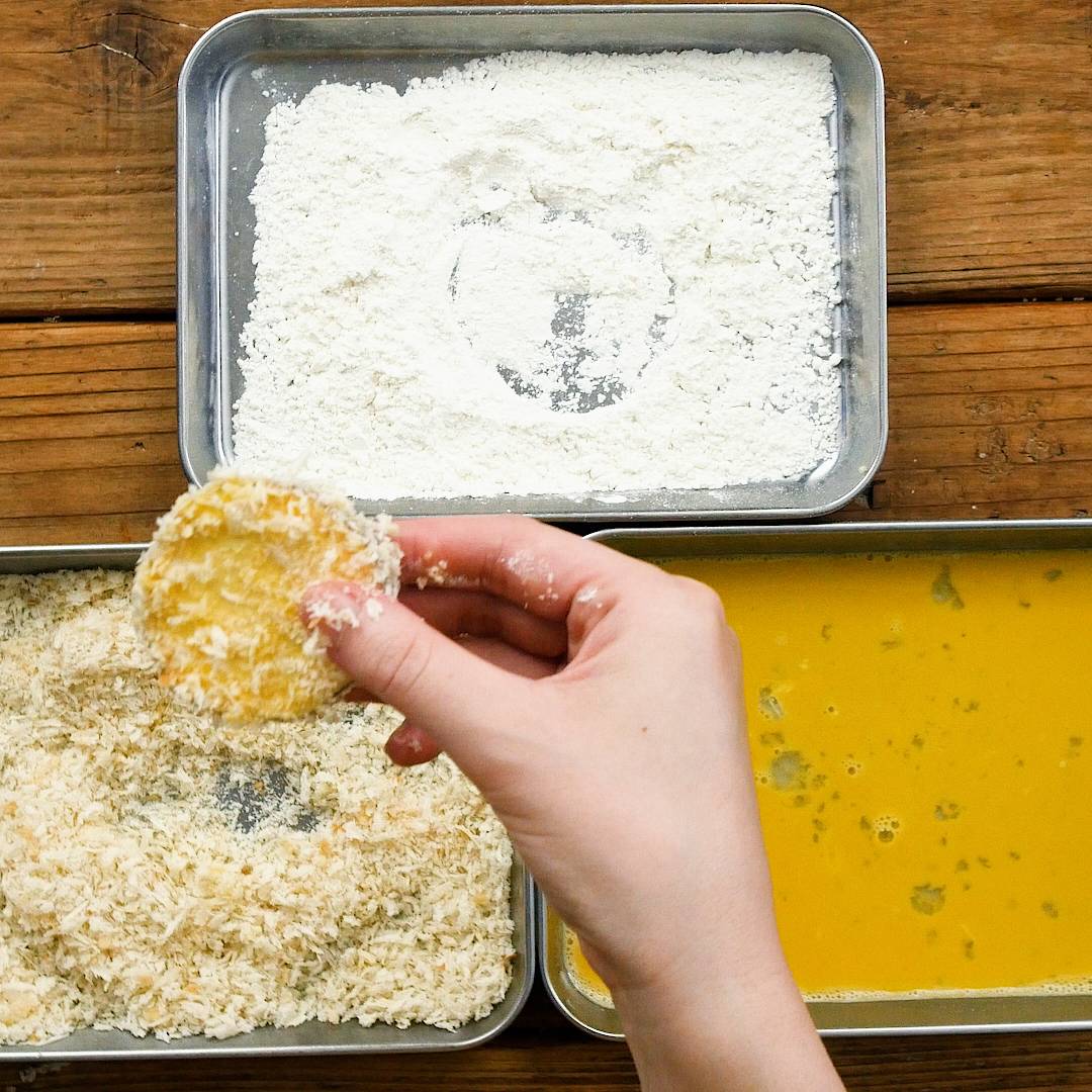 さつまいもに小麦粉、卵、パン粉の順に衣をつけ、両手で軽くおさえます。