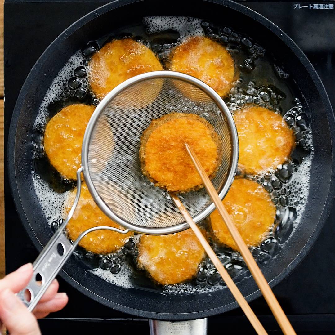 180度に熱した油に②を入れ、きつね色になるまで揚げたら完成です。