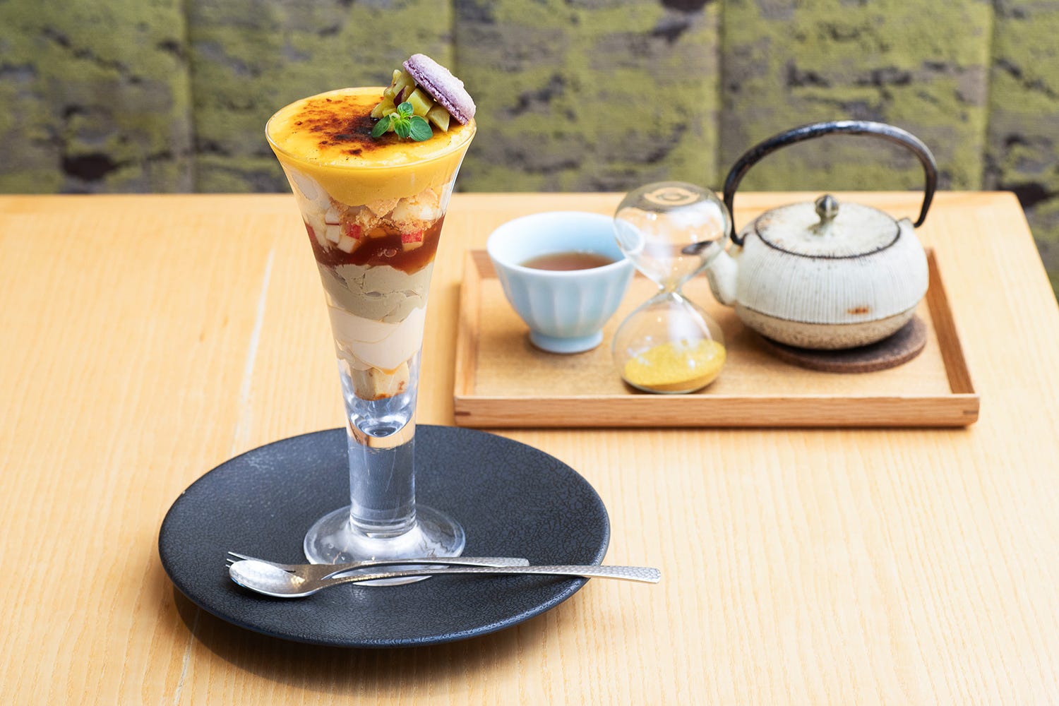 [神楽坂 茶寮]和紅茶とさつまいもの香ばしブリュレパフェ/日本のお茶セット 1,870円(税込)、お抹茶セット 1,980円(税込)