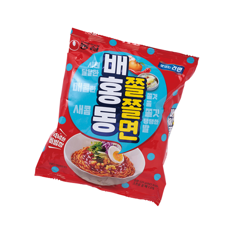 ベホンドンのチョル麺は赤地に水色のドット柄でインパクト大!フォントの丸っこさにキュンとする。