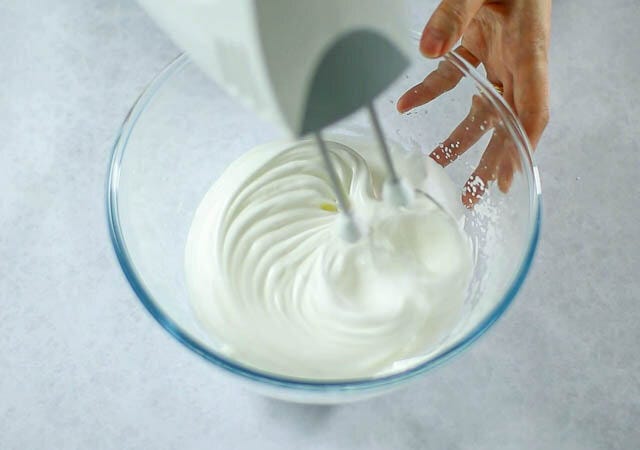 ③別のボウルに生クリームを入れ、7分立てにします(ツノが立たずすじが残るくらい)。