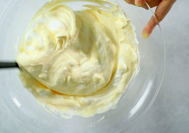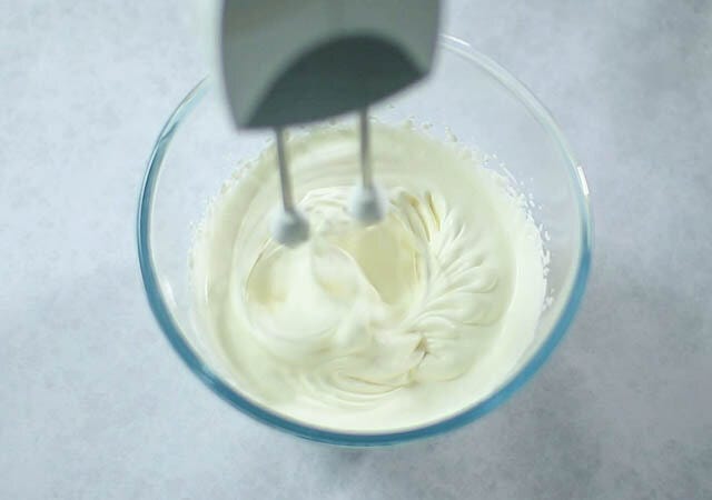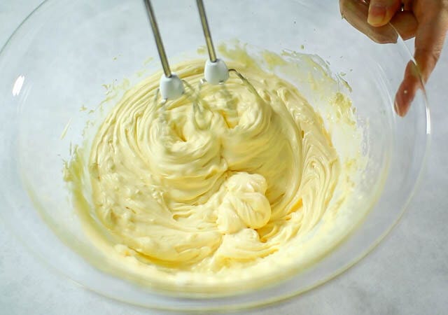 ②マスカルポーネを加えて混ぜ合わせます。ここはあまり泡立てる必要はなく、逆に混ぜすぎに注意して下さい。高速でさっと混ぜ合わせればOKです。