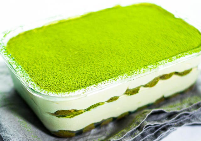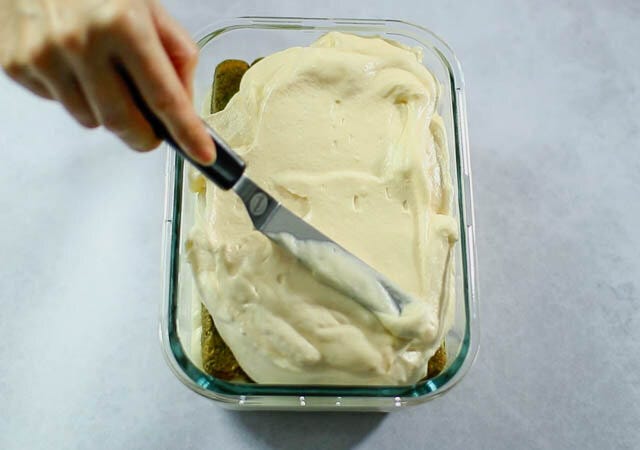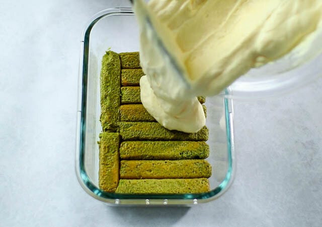 ⑧残りのフィンガービスケットを抹茶液を染み込ませながらクリームの上に並べます。マスカルポーネクリームを流し入れ平らにならし、冷蔵庫で2時間ほど冷やします。