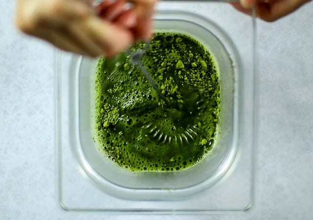 容器に抹茶パウダーをふるい入れ、80度くらい(一度沸騰させたお湯を他の容器などに移して一度冷ましたもの)のお湯を注ぎ、抹茶をよく溶かしてから常温に冷ましておきます。