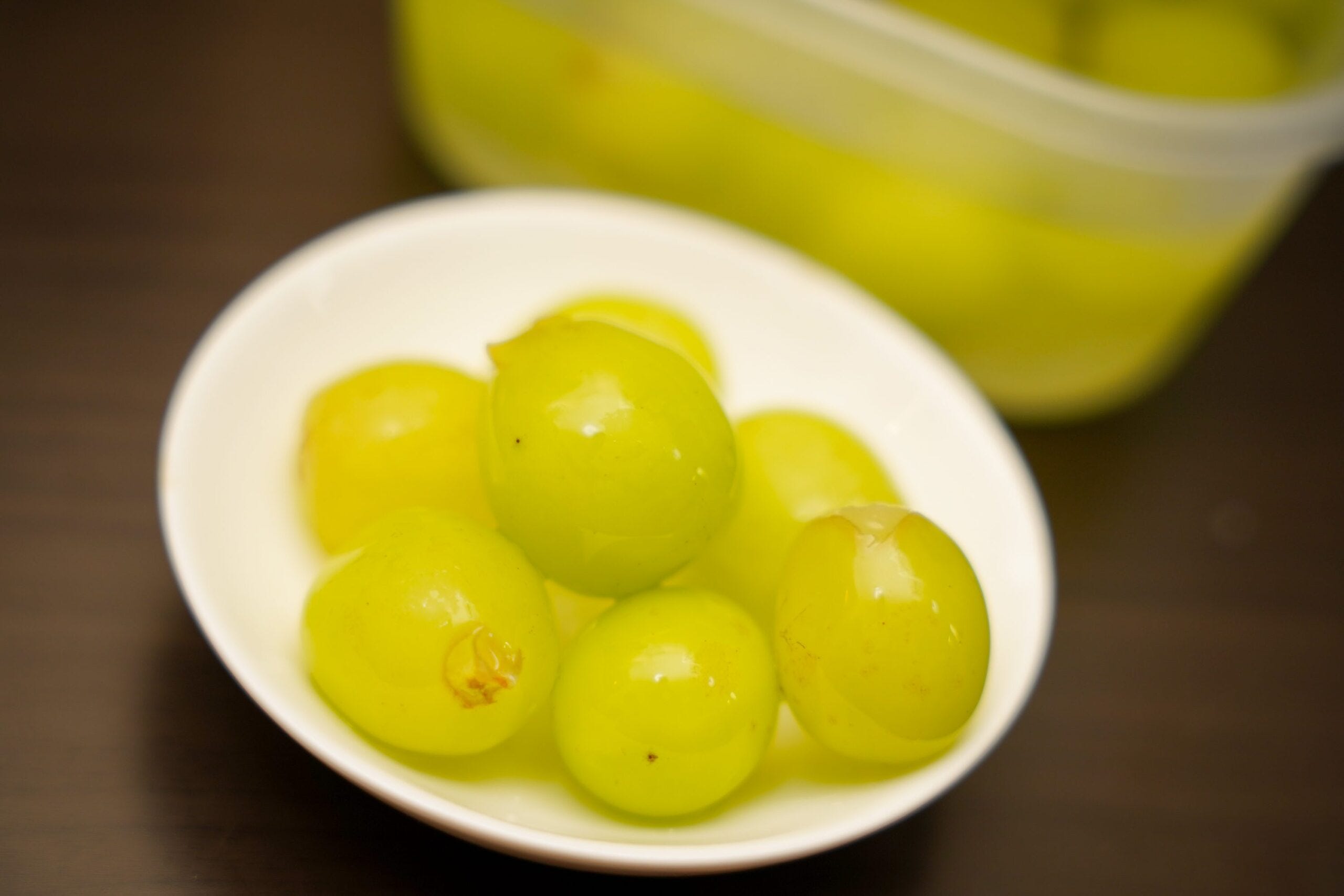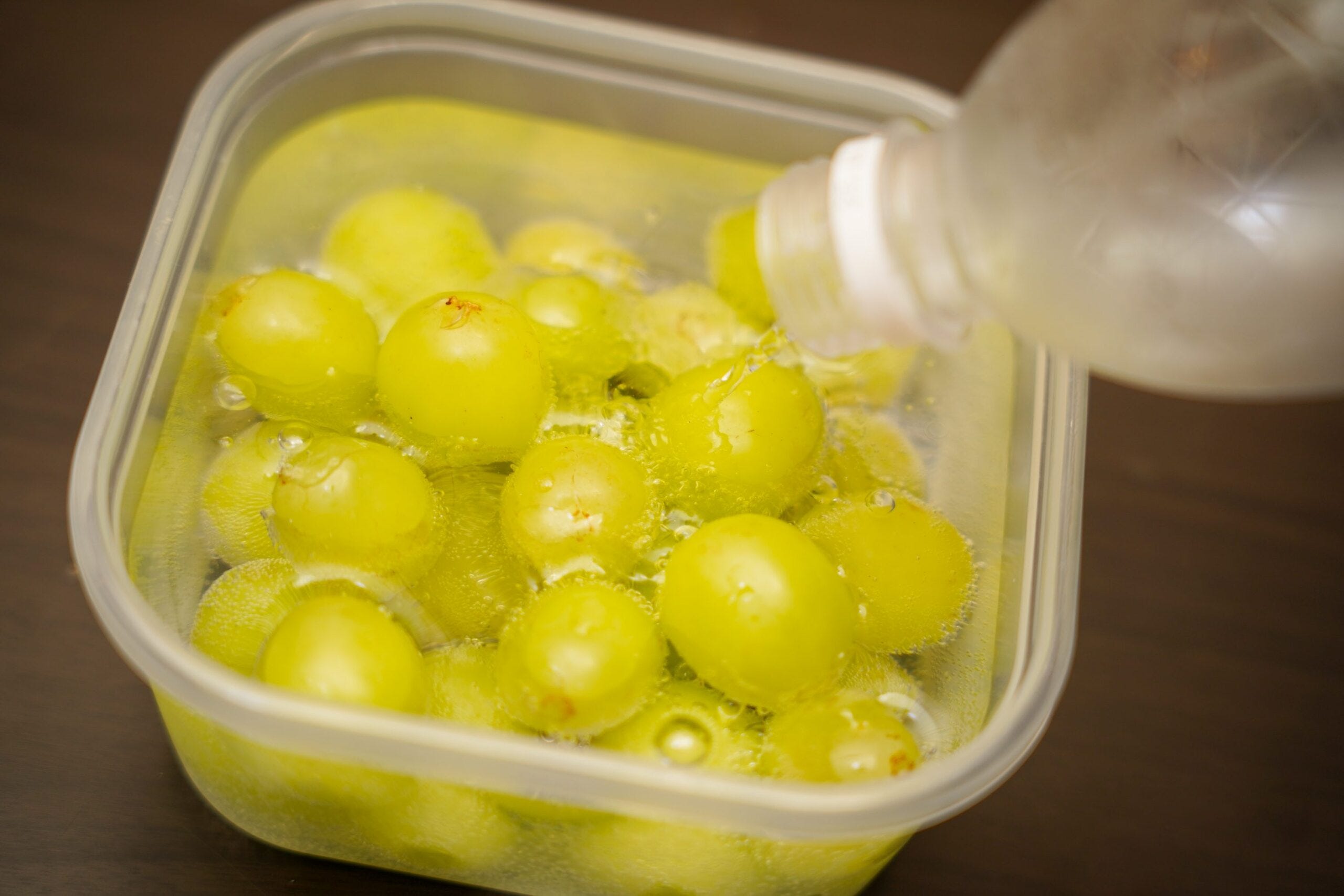 シャインマスカットを容器に入れたら、そこに炭酸水を注いでいく。炭酸水の種類は指定されていないようだが、できる限り強炭酸のものを選ぶと良いだろう。なお漬ける期間は一晩から3日間と人それぞれ。今回は誰しもが試しやすい一晩漬けてみることに。