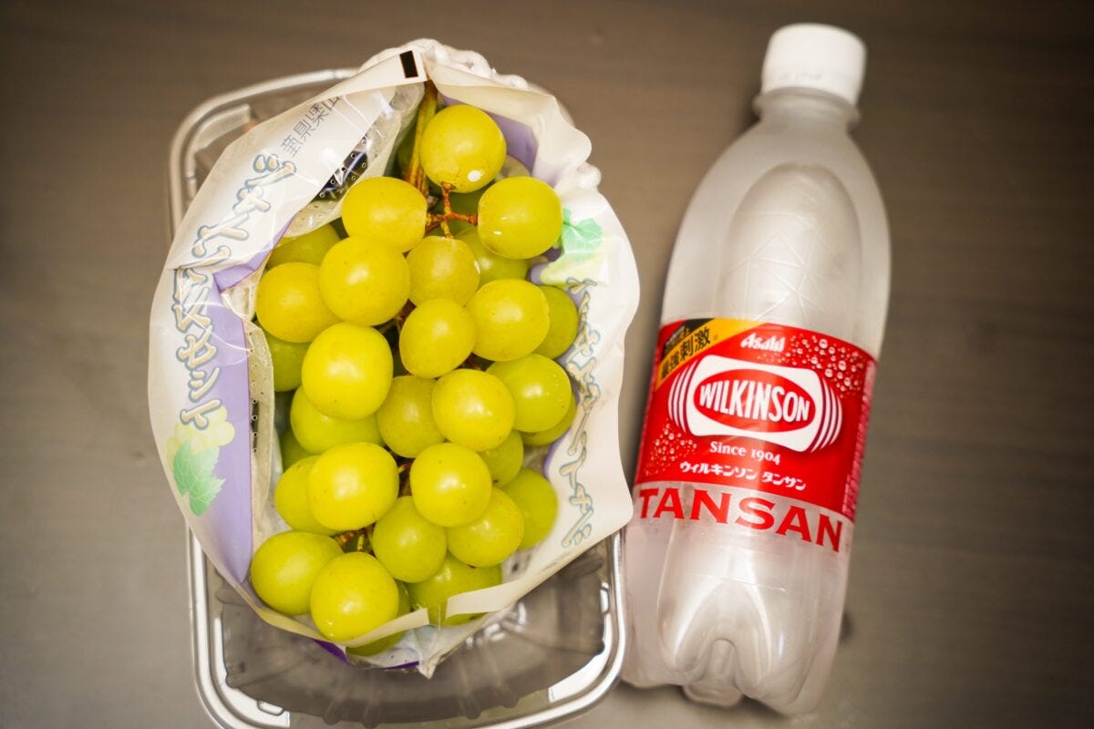その方法が「炭酸水に漬ける」というもの。シャインマスカットに炭酸水ならではのシュワシュワとした刺激がプラスされて激ウマになるというが本当なのだろうか...試していこう。