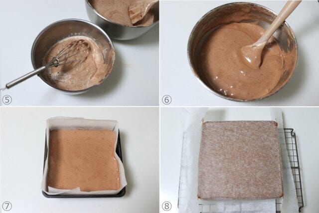 ⑦ 紙を敷いた15cmスクエア型に流し入れ、170℃に予熱したオーブンで約33分焼成する。