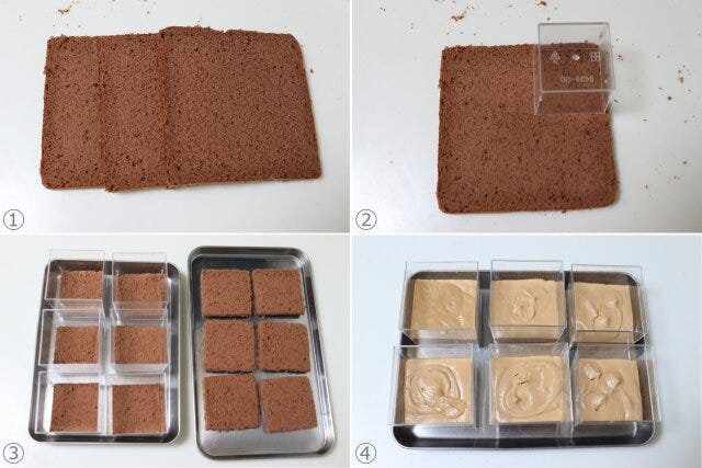 ① ココアスポンジケーキの底面と焼き面を切り落とし、1cm厚さにスライスする。