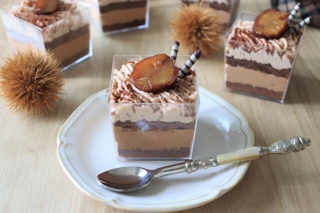 カップ仕立てのチョコマロンショートケーキの出来上がり。