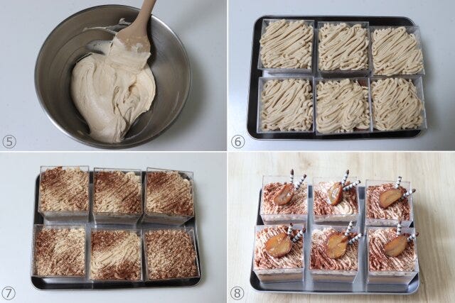 ⑥ モンブラン口金をつけた絞り袋に入れ、カップに6等分に絞る。