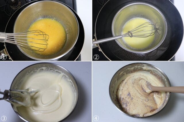 ① ボウルに卵とグラニュー糖を入れ、底を湯せんに当ててホイッパーで混ぜながら人肌より少し温かい位まで温める。