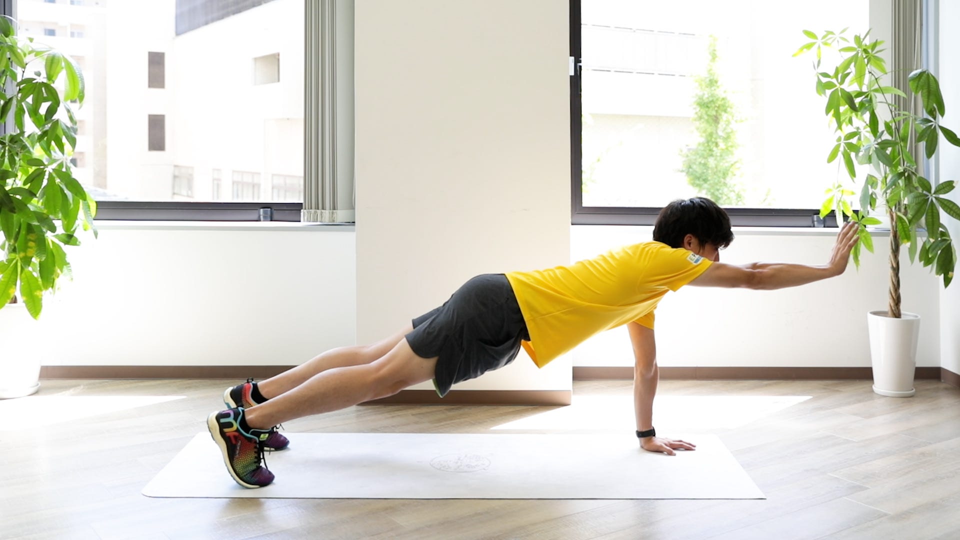 背筋を中心に胴体部分を鍛える体幹トレーニング「ワンアームレイズプランク」。通常のプランクよりも負荷をかけたい方におすすめのメニューです。お尻と大腿四頭筋を意識して、肩から腰、足先まで一直線になるように行なうことが効果を高めるポイント。