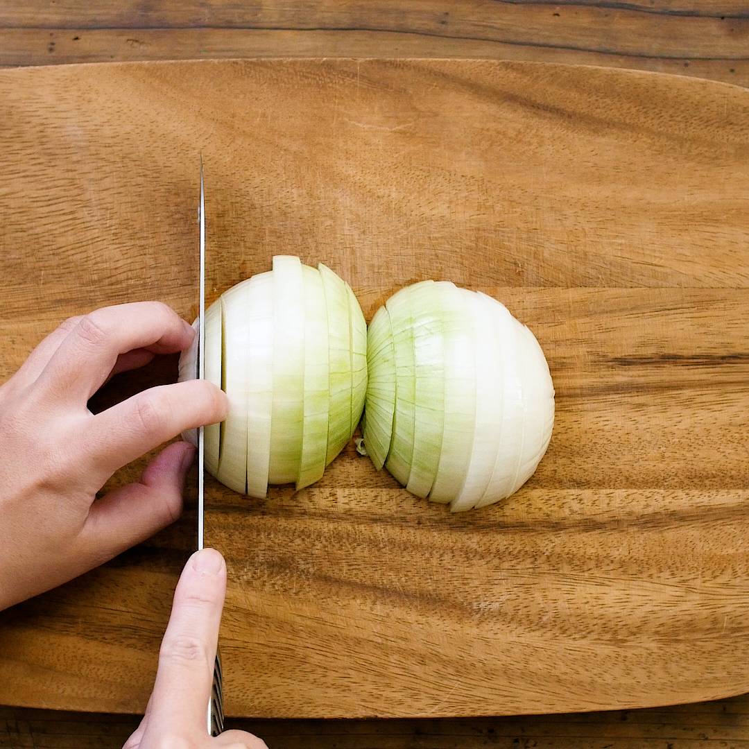 玉ねぎは半分に切り、繊維に逆らって1cm幅に切ります。