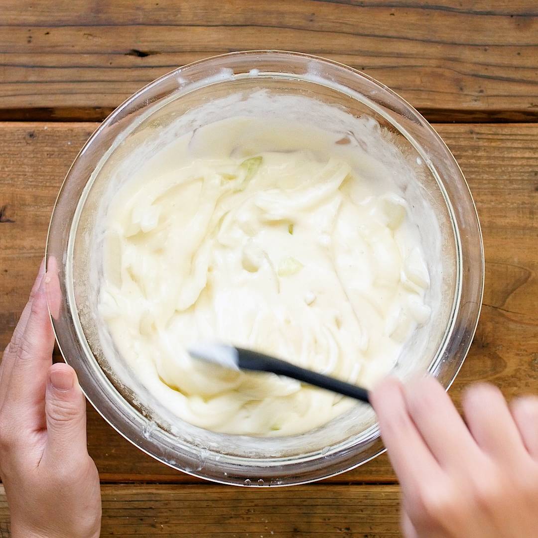 耐熱容器に玉ねぎ、小麦粉を入れて混ぜ合わせます。コンソメ、牛乳、バターを加えてふんわりラップをかけ、レンジ600Wで4分加熱します。