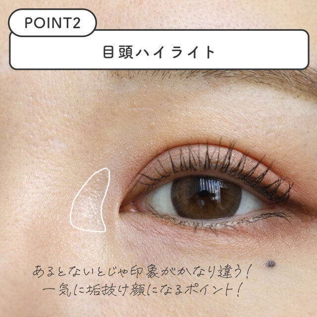 目頭にハイライトを入れるだけで目元が明るくなるだけでなく、鼻根(鼻の付け根)が高く見えたりと顔全体の立体感もアップします。