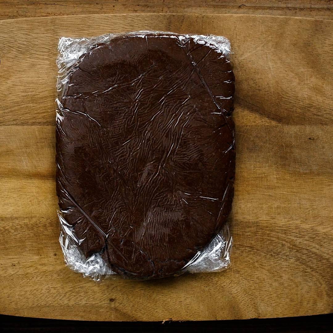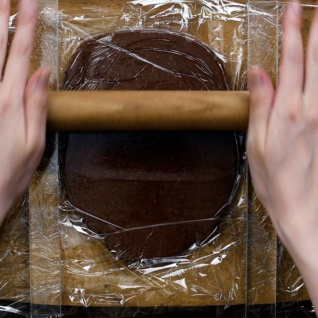 生地をラップで挟み、1㎝の厚さにのばします。冷蔵庫で2時間以上、もしくは冷凍庫で30~40分ほど生地を寝かせます。