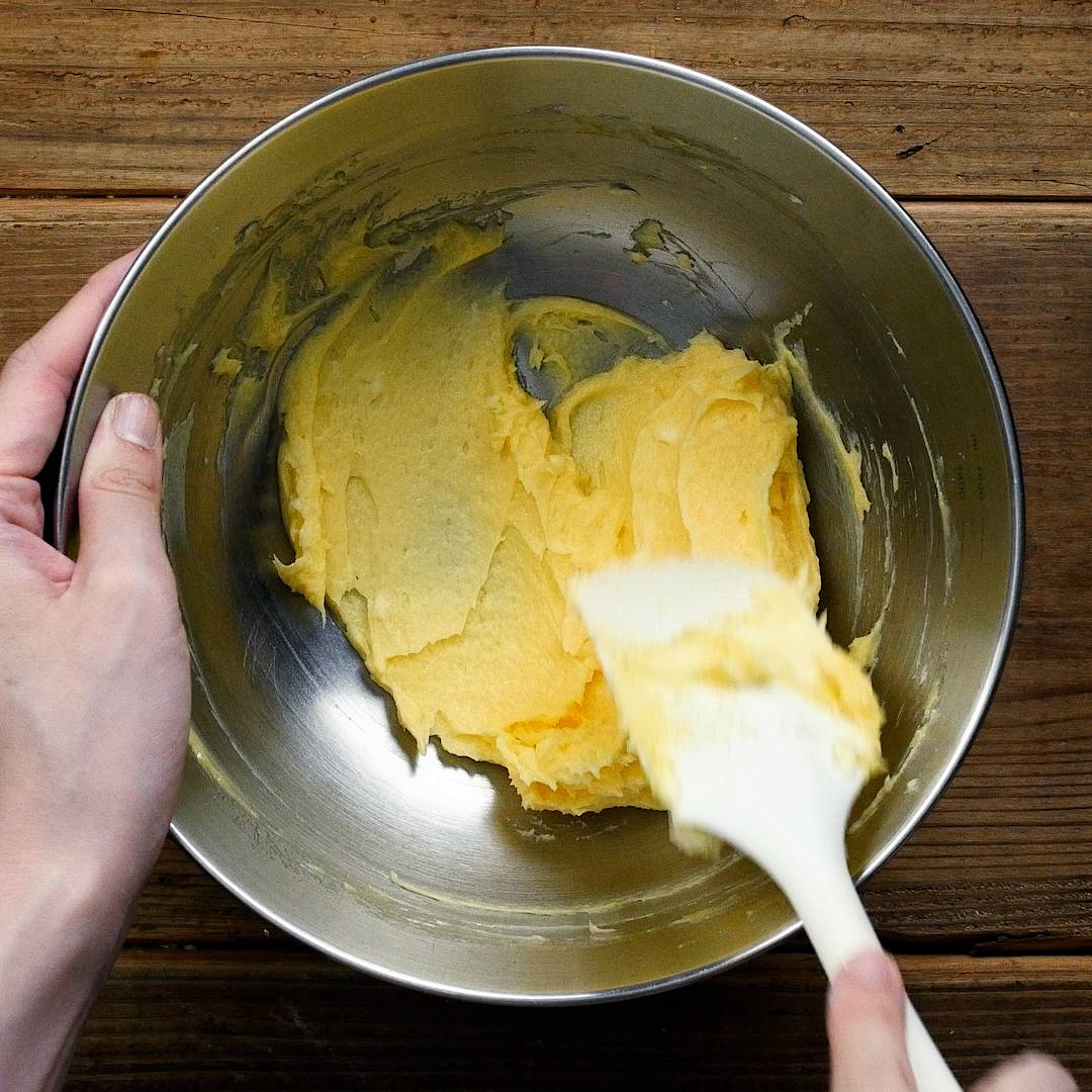 粉砂糖、卵黄の順に加え、その都度よく混ぜ合わせます。