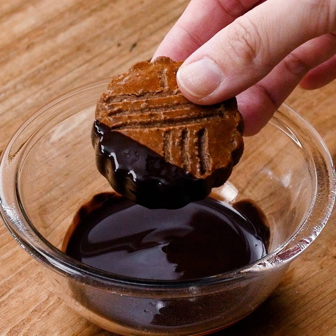コーティング用のチョコレートを湯煎で溶かし、焼きあがったクッキーにかけ、チョコレートが固まったら完成です。
